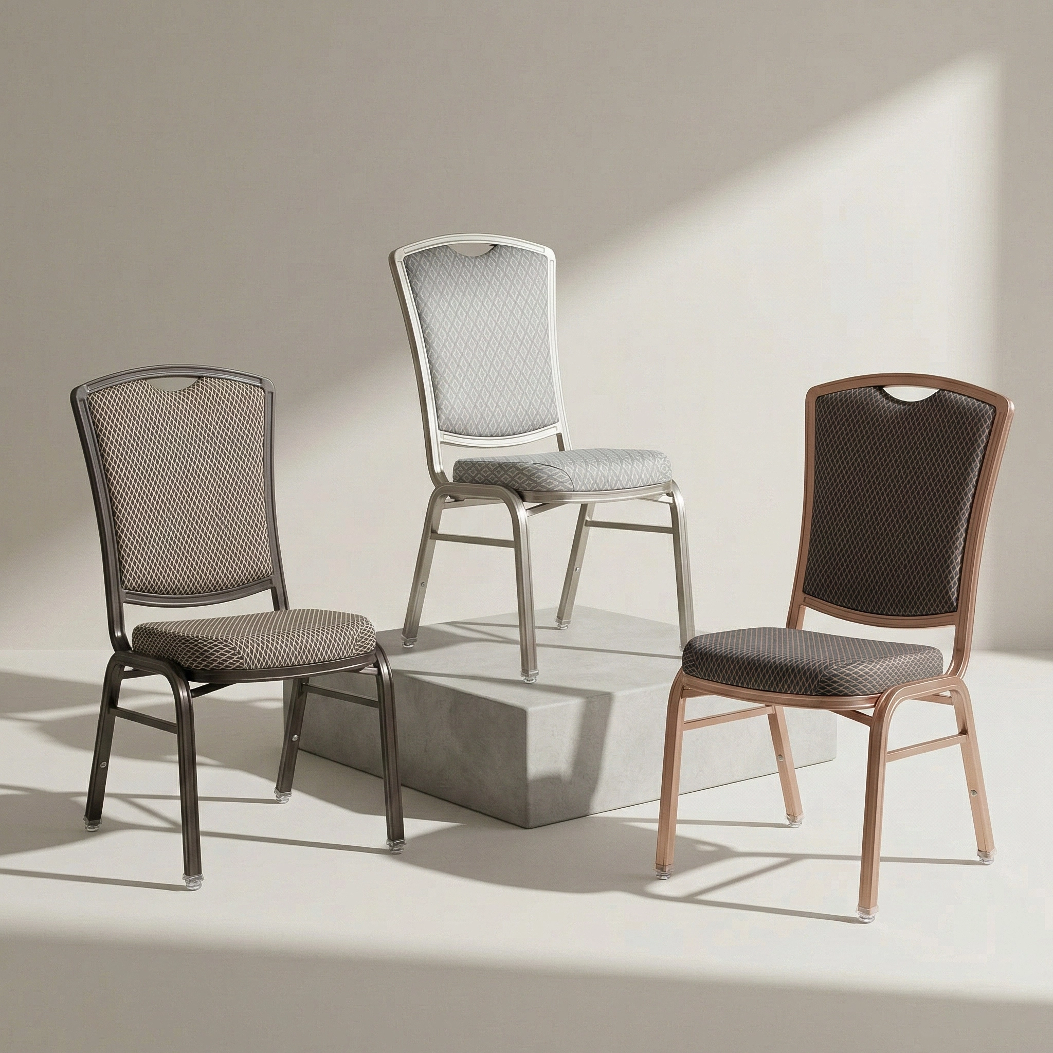 Aluminum metal frame Stacking Banquet Chair with upholstered seat and back.